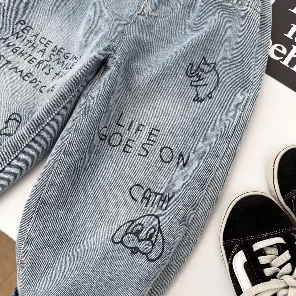 お子様の個性を引き立てる、ユニークな落書きデザインのデニムパンツです!