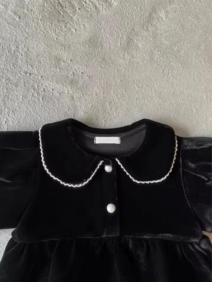 光沢のある上質なベルベット生地を使用した、うさ耳ボンネット付きのロンパースです。