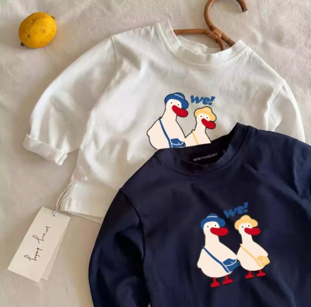 ゆるい表情のアヒルさんが並んだ、とってもキュートな長袖Tシャツです。