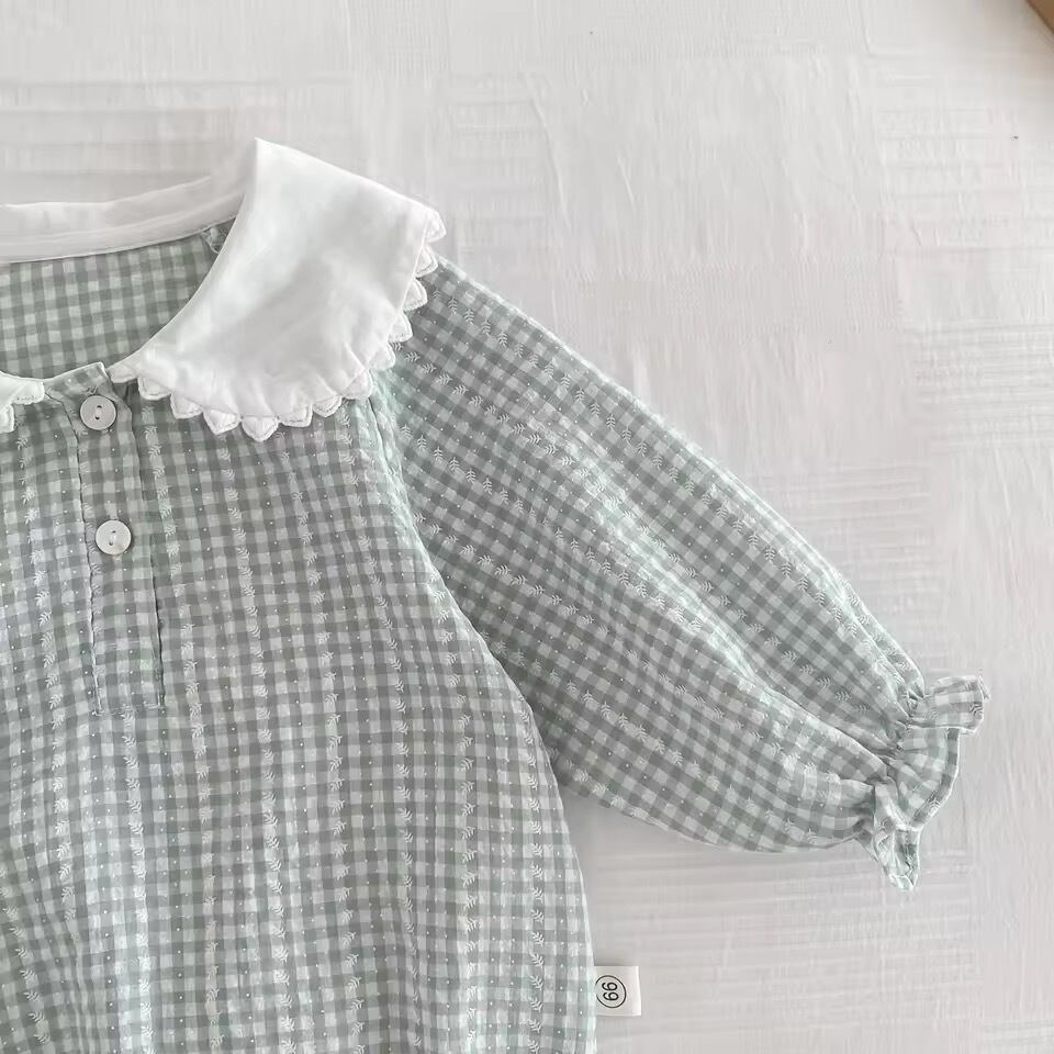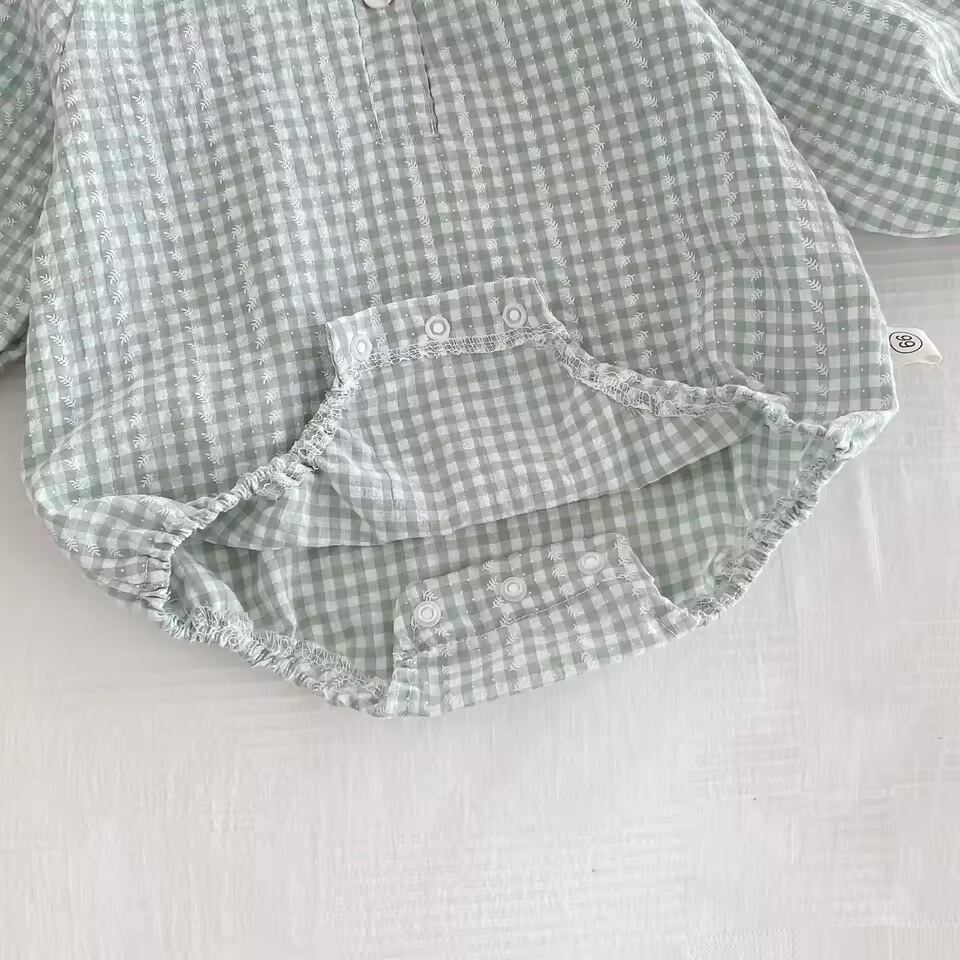 優しいミントグリーンのギンガムチェックが赤ちゃんの可愛さを引き立てます