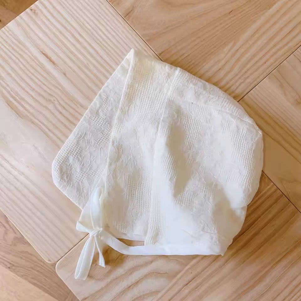 お揃いのボンネット付きで、特別な日のお出かけやお披露目にもぴったりな一着。