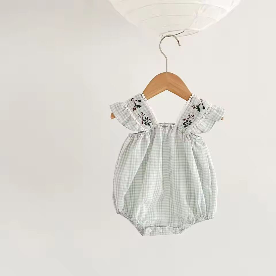 ふんわりとしたミントグリーンのギンガムチェックが爽やかなベビーロンパースです。